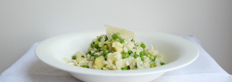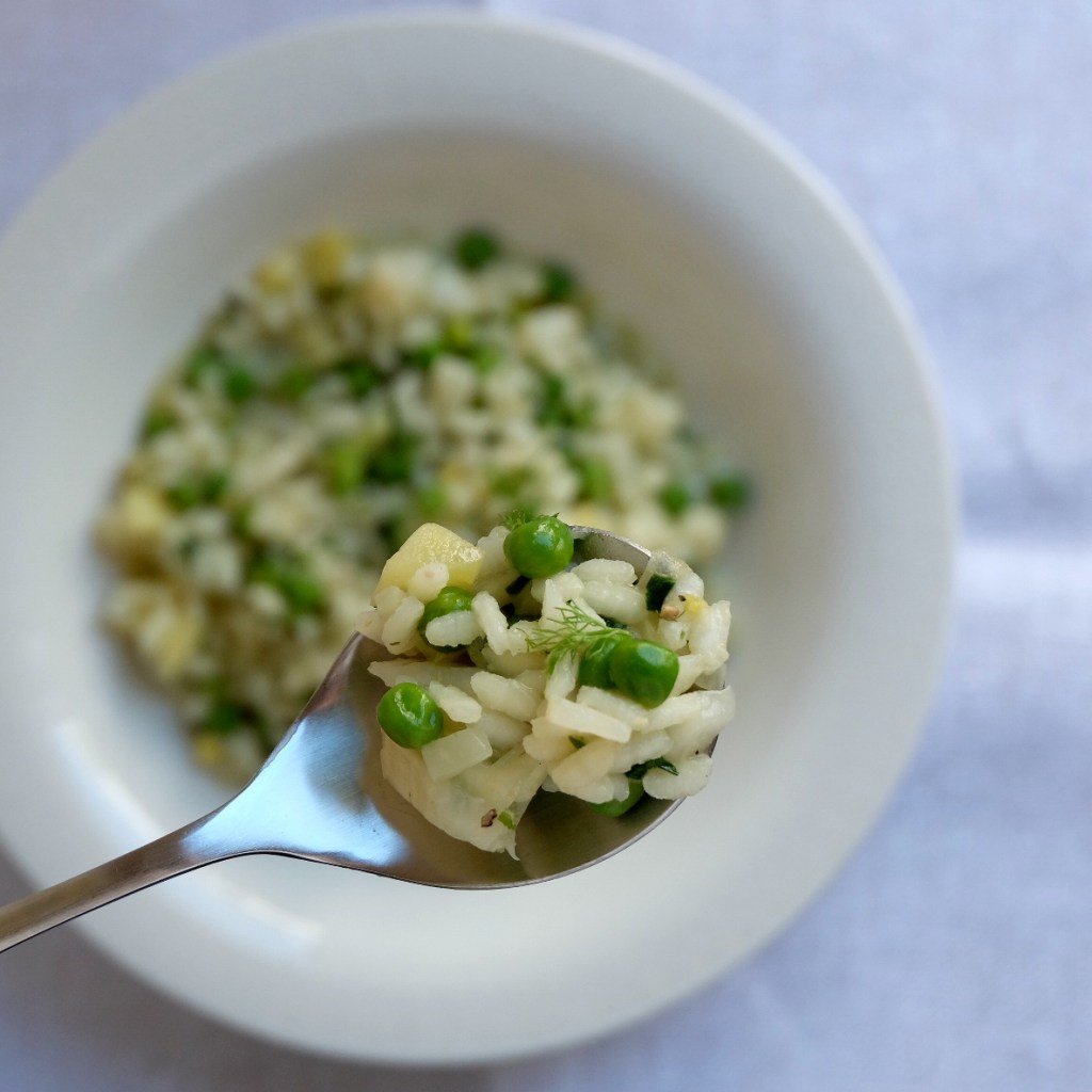But what about the fennel, the apple & the peas? The fennel can be mixed in halfway through the process, the apple 10 minutes and the peas 5 minutes before the risotto is cooked. In with the peas go the fennel green & the wild garlic. Of course you can vary this timing – but I like the fennel & the apple still firm as it creates a texture difference.