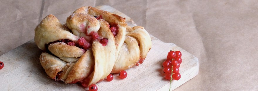 - For the Kanelknuter fold the rectangle once. Cut into stripes two thumbs big. Take a stripe and twist carefully (a few red currants will fall out nonetheless). Make a knot into the twisted stripe and tie both ends underneath. Place them on a baking tray lined with baking parchment and bake for about 20 minutes. Pay attention to the baking process they might need a little longer or shorter. Take out, brush with a bit more margarine and sprinkle with a little more sugar (to your taste), leave to cool (but not until completely cool) and enjoy…