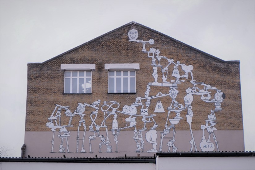Starting at Hackney Marshes we strolled down the canal until we came to Victoria Park. It’s an arty area with lots of cafes and bistros, graffiti and houseboats. The boats look partly shabby and run down but some are spruce and fancy with a little garden on top of the boat.