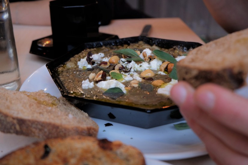 What we had: Lentil soup with mushrooms, hazelnuts and greek cheese (see down). Leek Toastie with cheese. Banana Bread. Breton Cake. Coffee.