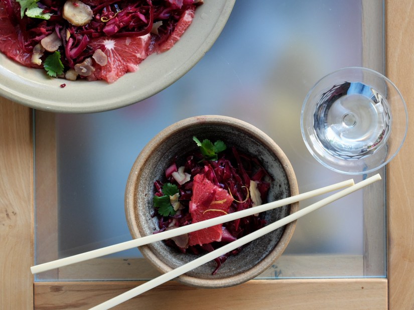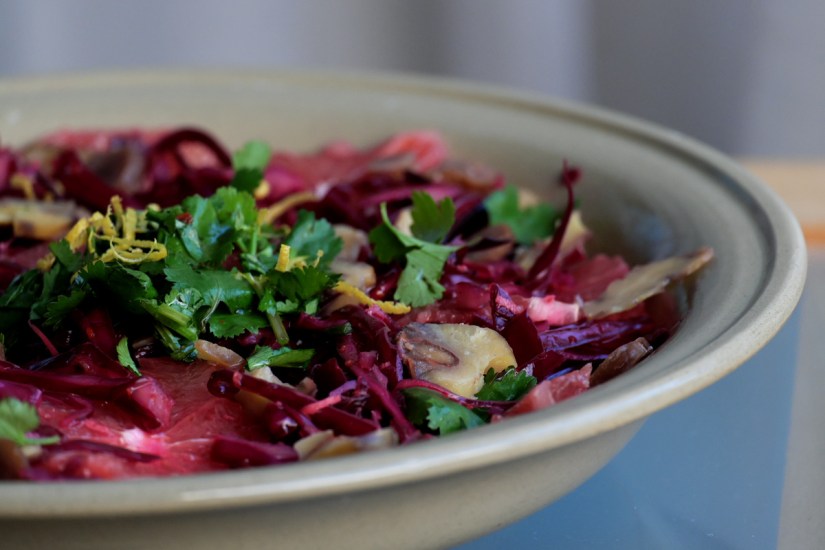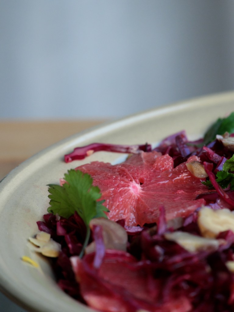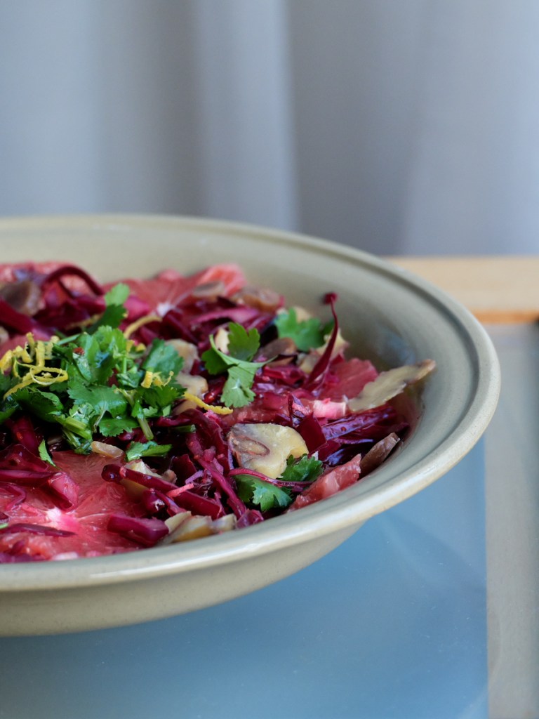 Shred the red cabbage into very finely. Grate the ginger finely into a big bowl. Peel off the lemon zest add half of it to the ginger, squeeze the lemon and pour the juice onto the grated ginger. Add the chili flakes, sesame oil and salt. Mix everything before you add the shredded. Use gloves if your skin is sensitive to lemon juice and chili and massage the dressing into the cabbage. Massage for 5 minutes. This really “activates” the red cabbage and softens it, so it’s more digestible. Let the cabbage sit in the bowl while cutting off the whole grapefruit peel. Slice the peeled grapefruit and the chestnuts into thin slices. Wash the coriander and pluck the leaves off the stems. Arrange the cabbage onto a nice plate, put the slice grapefruit and chestnuts on top, decorate with coriander leaves and the remaining lemon zest and drizzle with a little agave syrup. Here’s your super yummy Asian red cabbage salad!