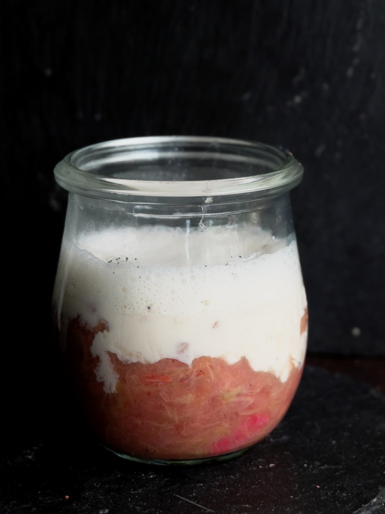 Cut the rhubarb into slices and wash thoroughly. Cut the dates into fine pieces and combine with the rhubarb in a large saucepan. Add a little water, so the bottom of the pan is covered. Bring to the boil, cover with a lid and let simmer for 10 minutes on medium heat. Scrape the vanilla pod and add the fresh vanilla to the compote. Cook until your favourite consistency is reached – I prefer my rhubarb still pink and not tooooo soft.