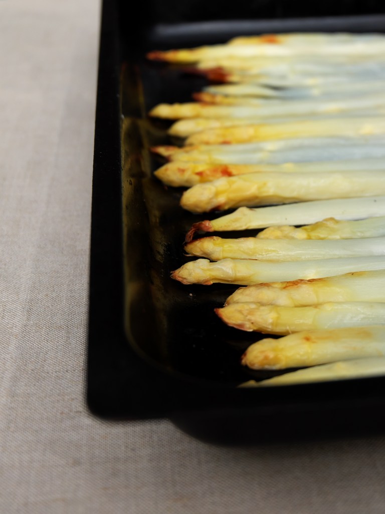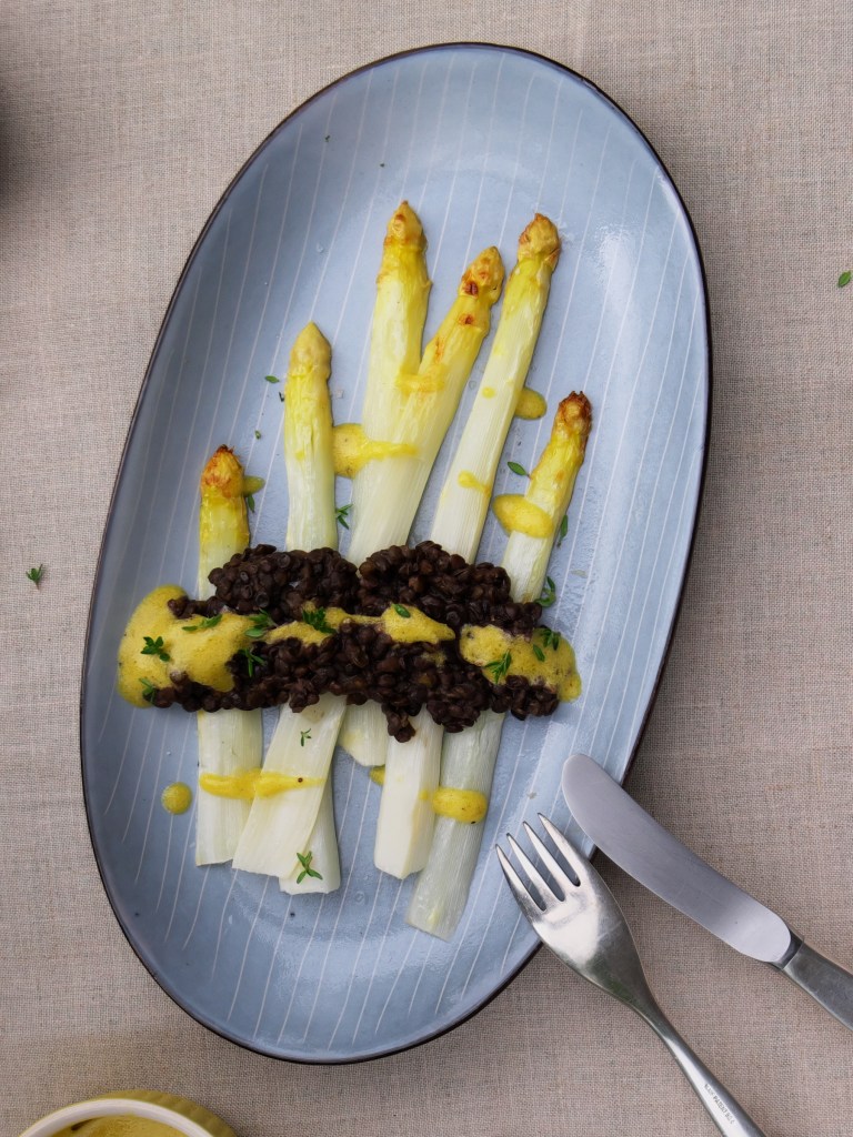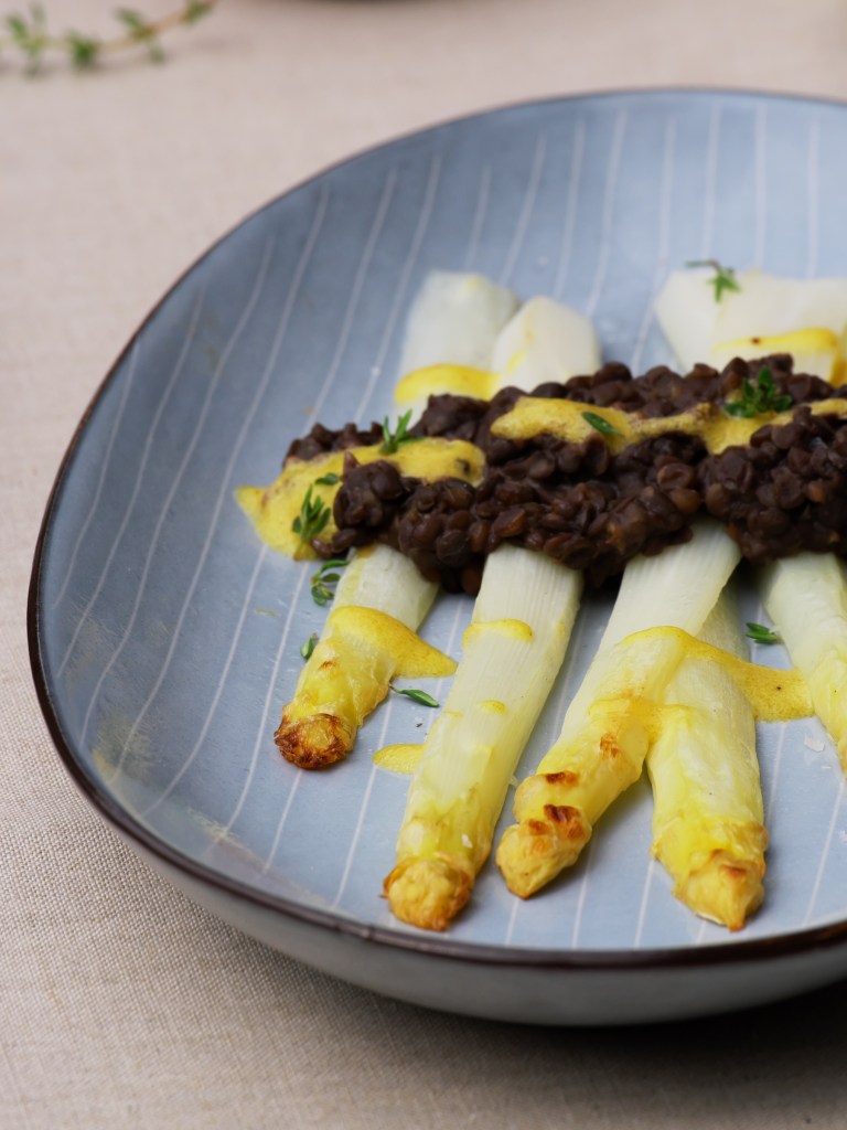 Es ist noch Spargelzeit und deswegen möchte ich euch eine feine Version der Spargelzubereitung zeigen. Schon mal den Spargel einfach im Ofen gebacken? Das geht super schnell und einfach, der Spargel kommt schön bissfest auf den Tisch und hat sein Aroma an kein Kochwasser abgegeben. Zu den gebackenen Spargelstangen werden cremige Belugalinsen und ein Thymian-Senf Sößchen serviert.
