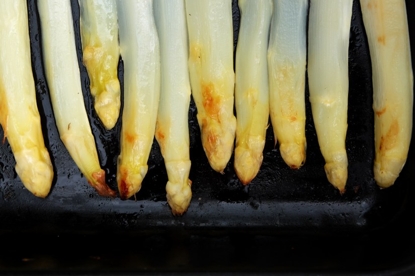 - Den Spargel schälen und auf ein Blech legen.